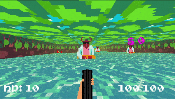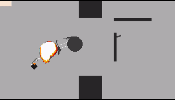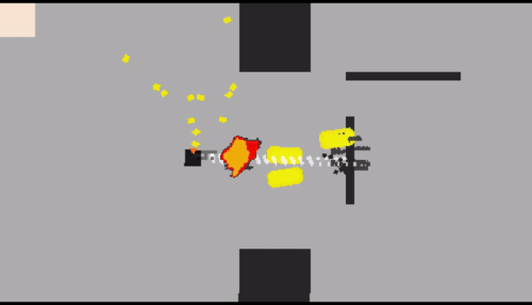 A game designed to have tons of feedback, guns knock the player backwards and recoil, bullets spread and ricochet, leave smoke trails. Game features a 'survivor' style horde spawning system.