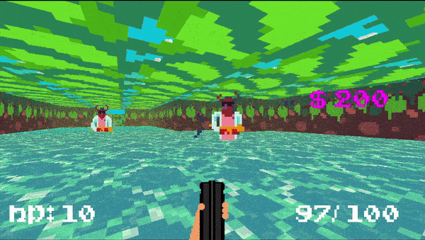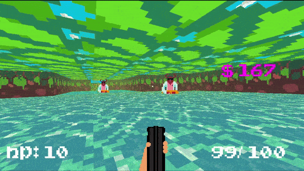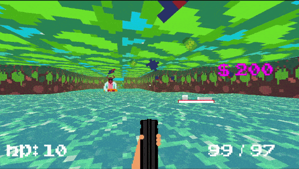 The player cannot aim up or down, only left and right. To ensure skill based gameplay, I implemented a hit-box based system where different body parts can be shot off, and accuracy is rewarded with instant kill headshots. Game features 7 levels, 4 enemy types, 2 guns and all 3D is manually drawn using primitives as Gamemakers 3D functionality is extremely lacking. Bodies float in the water, blood splatters the walls, shells rebound off objects.