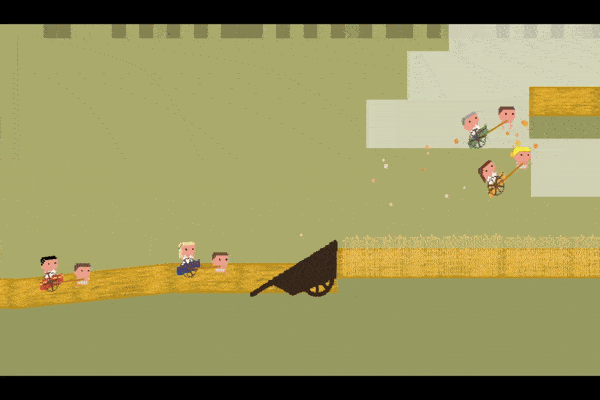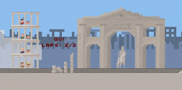 Is a fast paced 2D physics racing game. Designed for 4 players in local versus mode, (although containing bots for singleplayer). The game is a fun, silly romp through ancient pixel rome, with 4 playable characters, tons of pickups to enhance your chariot or toga wearing chariot puller. The game features 5 levels of chaotic chariot action.